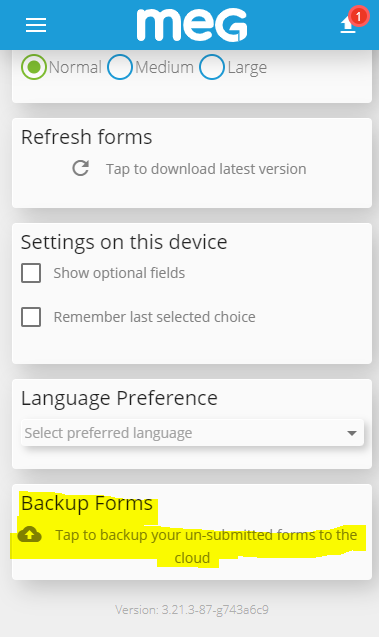 To back-up all data from the app to the cloud, go to Settings and scroll down to “Backup Forms” option.