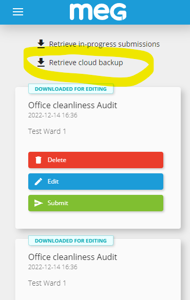 To download backup data from cloud, go to “Saved Data” and click “Retrieve cloud backup”. A pop-up will show with a list of saved form data.